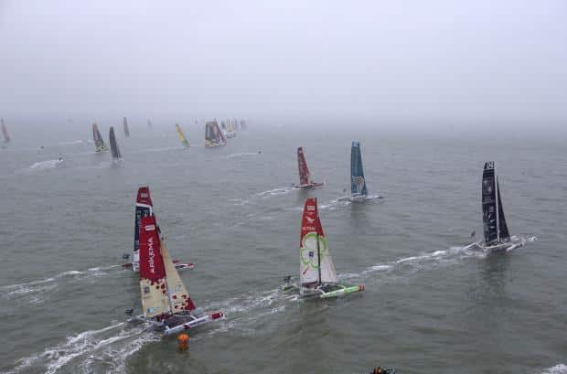 Desjoyeaux and Gabart’s heartbreaking end to their race could have been one of many dismastings or other such incidents in the fleet—but it was not. On the day of the scheduled start, the fleet was set to head straight into 60 knot winds and cresting waves of 20 feet or more in the Bay of Biscay. A large percentage of the 44 boats taking part would have invariably abandoned the race. But as it turned out, the race organizers decided to postpone the start by four days.