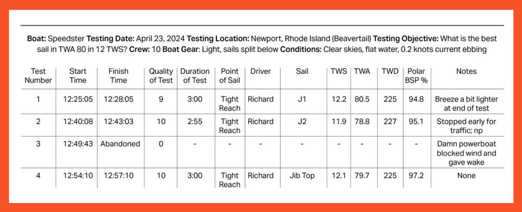 A few examples of next-level considerations would be noting wind shear (which is especially noticeable on cold mornings where there’s 8 knots at the masthead and nothing on water), boat weight and balance (don’t compare numbers with a laden boat prepared to go to Hawaii versus a light boat set up for daysailing), and variables such as who was driving and when. Good science is about eliminating variables so that you see the signal, not the noise.
