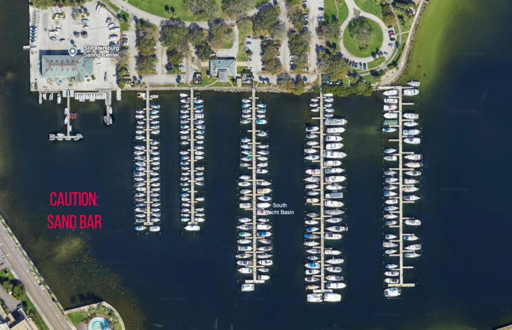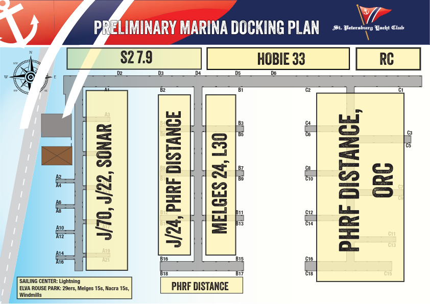 All other fleets will be distributed between the St. Petersburg Sailing Center and the SPYC Downtown Marina. Please refer to the dockage map below for the division of fleets.