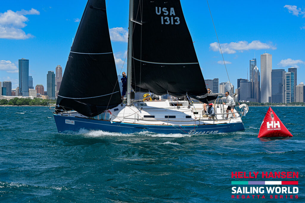 Cliché as it may sound, the Windy City indeed lived up to its reputation on the opening day of the Helly Hansen Sailing World Regatta Series in Chicago, hosted by Chicago Yacht Club with more than 150 race teams participating. The warm bright morning sunshine and the blocking of the architectural giants of the lake front may have duped many of the competitors into thinking conditions were benign as they slipped their lines this morning. But out on the open water, northwesterly gusts peaked into the high 20s, catching many teams off guard. The day was good fast sailing for some, while for many others today’s races were all about the preservation of gear, sails and crew.