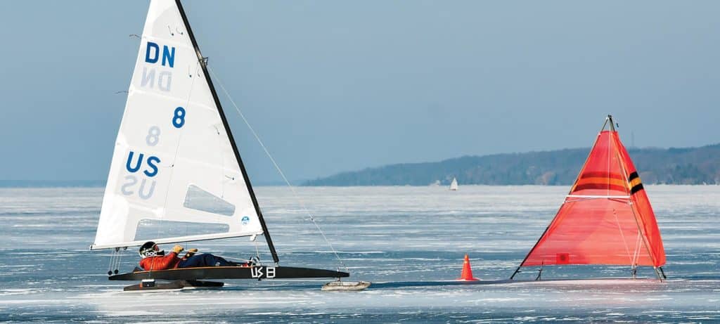 I wouldn’t know either way, because it’s my first DN iceboat start, my first race and really only my fifth time sailing my DN. Bolted to US 8 is a set of used runners I bought hours before the regatta, and frankly, I have no idea what I’m doing out here on the ice. But I’ve always been a fast runner, and the week before, at the gym, I did sprints to condition my legs and make sure I don’t pull a hamstring.