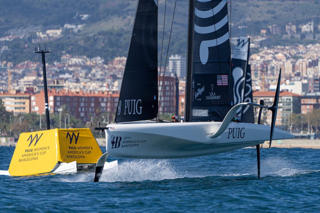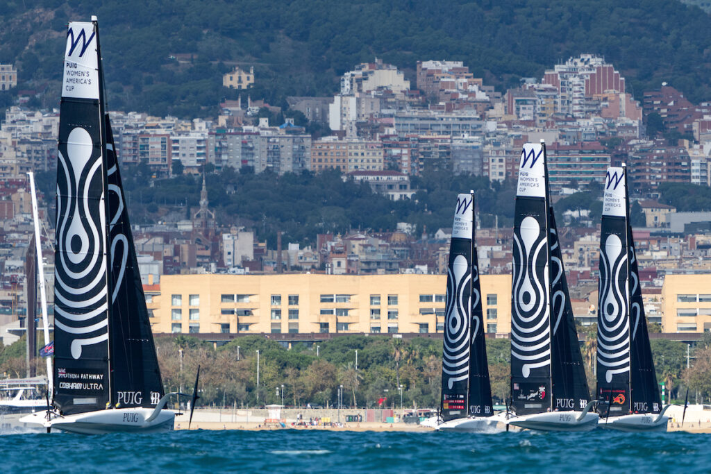 With the AC75s of Emirates Team New Zealand and INEOS Britannia tucked in their sheds getting final nips and tucks ahead of this weekend’s start to the Louis Vuitton 37th America’s Cup all was quiet along the waterfront. And it would have been easy to miss the simmering excitement at Barcelona’s Port Olimpic if were not for the boisterous arrivals of the chase boats of Luna Rossa Prada Pirelli and American Magic, packed full of team members to spur the women of the Puig Women’s America’s Cup as they wait to dock out for one final day of qualification races.