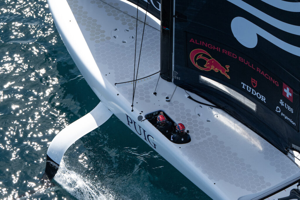 INEOS’s Athena Pathway says, thank you very much as they temporarily snatch on final approach to the leeward gate. But in a blink the Brits are off the foils too and doing the displacement foredeck dance. Now streaking down the middle of the course with a straight shot and through the gate first is Alinghi Red Bull Racing’s squad.