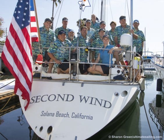 The crew onboard Second Wind sports some festive team gear for the start.