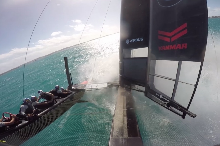 Oracle Team USA has a close call on a high-speed capsize while training onboard their AC45 in Bermuda.